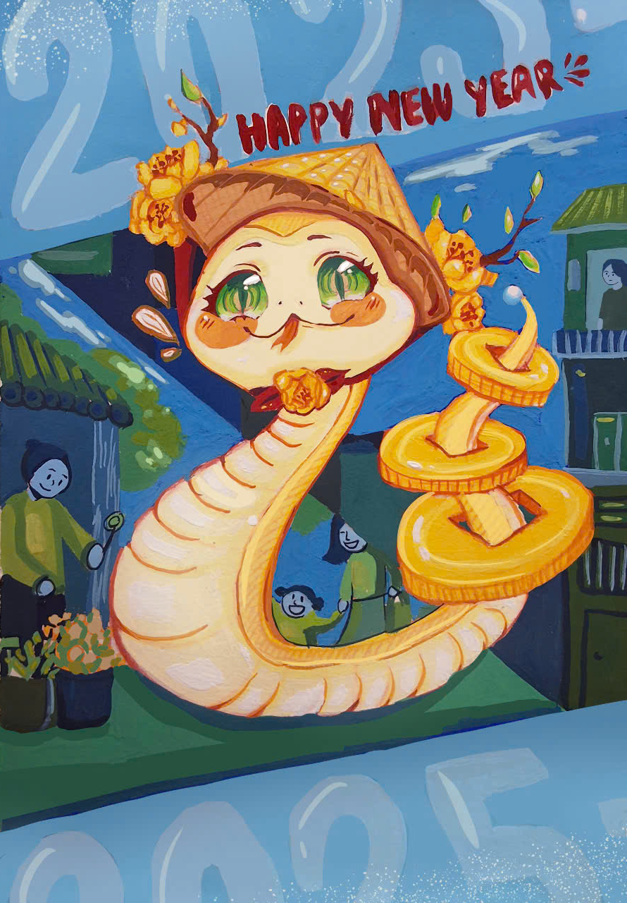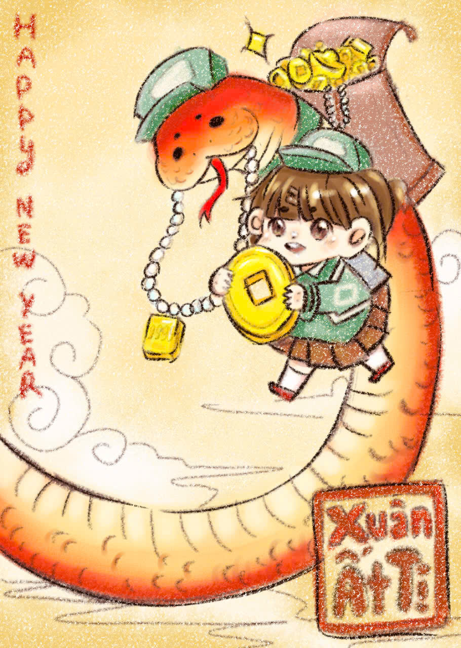 Created as concept art for Tết lucky money envelopes, these illustrations feature a vibrant and playful chibi aesthetic inspired by the Year of the Snake. Each design expresses joy, luck, and festivity through bright tones and clean, dynamic linework.